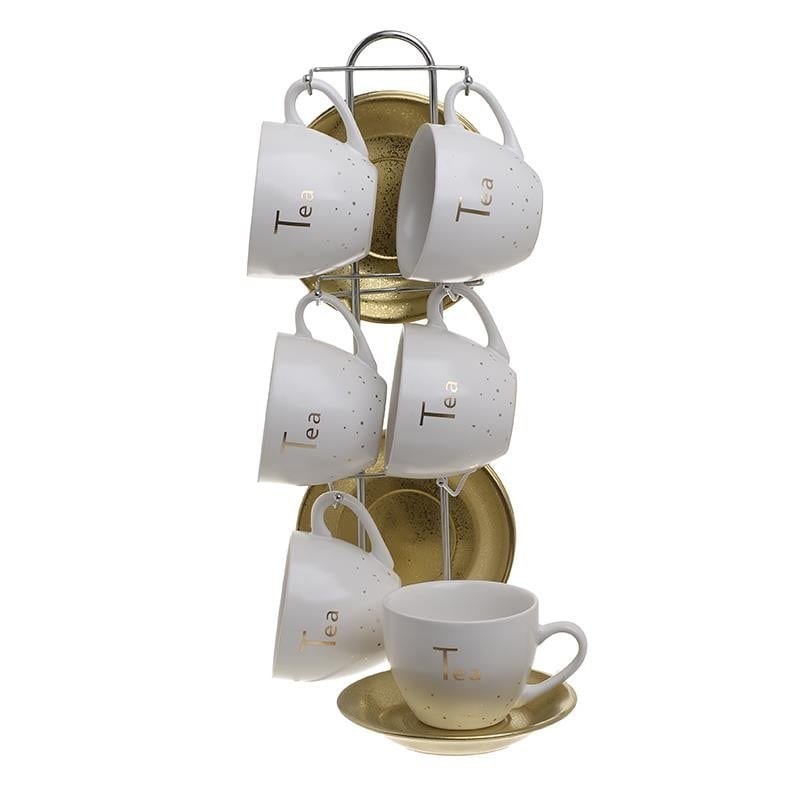 1 tea set: 6: cups: length: 8 cm, width: 10 cm, height: 6 cm & 6 saucers: diameter: 12 cm, height: 2 cm & 1 base: length: 15 cm, width: 13 cm, height: 36 cm