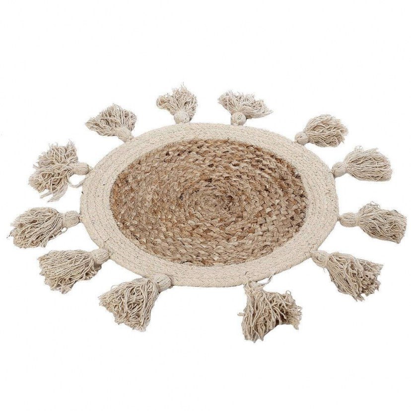 The Round Placemat KUF103 will impress even the most demanding, due to its unique design. Make it yours and it will bring a natural and boho design to your table. It is suitable for professional use and for contact with food. It is handmade from jute and cotton, so the dimensions may vary slightly. Washing is prohibited. Quality: Jute & Cotton Dimensions: 1 Placemat: Diameter: 35 cm, Height: 1 cm
