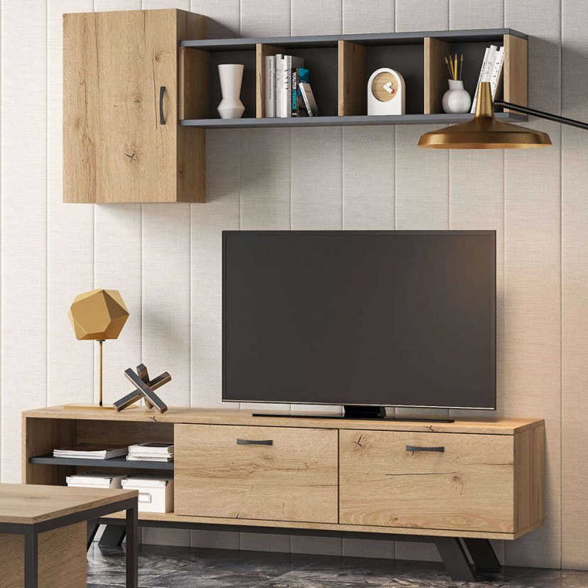 TV Composition No44 features a variety of storage spaces that meet all your needs. The central furniture of the composition includes two closed storage spaces to keep your numerous accessories, favorite books, and anything else you want to have organized and displayed. Two spacious shelves are the ideal place to put your electronic devices. However, the impressive beauty of the composition comes from the wall-mounted shelf and the wall-mounted cabinet. These functional extensions create an impressive arrangement on the wall, allowing you to display your favorite decorations, store objects, or even organize your collection in a way that fully represents you. The product is delivered unassembled.