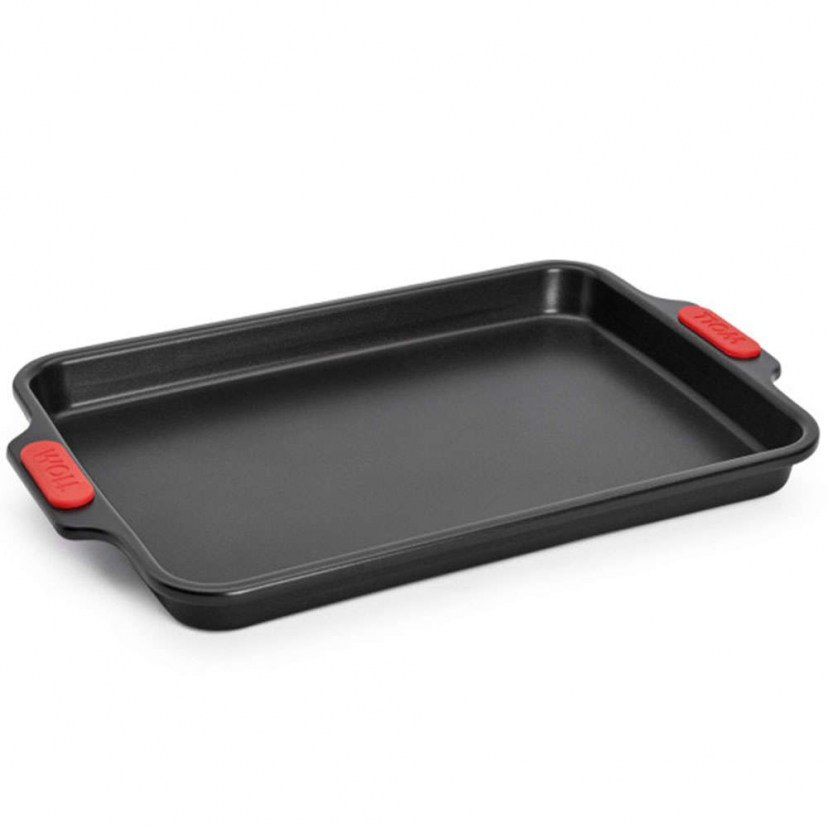 The Non-Stick Rectangular Pan Let's Bake! WB06 is made of steel and coated with a diamond non-stick coating to ensure that your food comes off easily and without damage, offering excellent cooking performance. Fast and even heat distribution ensures perfect baking across the entire surface, making it ideal for cakes, cookies, baked goods and more. The durable construction of the pan ensures that it will accompany you for years in the kitchen, while the silicone handles, resistant up to 230°C, offer comfortable and safe handling, even when the pan is hot. It is dishwasher safe.