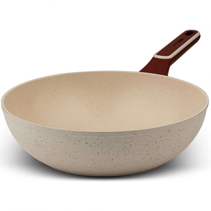 The Non-stick Wok Terrestrial 10-144-310 is an amazing choice to prepare the most delicious recipes, especially Asian dishes. It is characterized by high thermal conductivity, which enables it to heat up very quickly and maintain its temperature for a longer period of time. It is made of aluminum and fits perfectly on the hobs, as a result of which the heat is evenly distributed over the entire surface of the pan for perfect performance, while you will save energy by cooking at a low temperature. It has a high-quality three-layer non-stick inner surface for long-term durability. Externally, it is extremely resistant to abrasion. The ergonomic and non-heated soft touch handle provides a comfortable and safe grip. During its manufacture there is a significant reduction in carbon dioxide emissions, while it does not contain PFOA. It is suitable for gas, electric, ceramic, halogen and induction hobs, as well as for the dishwasher. Needs to be washed before first use. Before each use, you must grease the utensil with oil or butter. You can combine it with the other cookware of the Terrestrial series and upgrade your cooking. Quality: