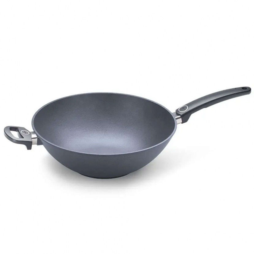 The Non-Stick Pan - Wok Titanium Nowo 1132-1IL is an excellent cooking utensil that combines durability and efficiency for exceptional cooking results. It is made of 9 mm thick cast aluminum, which makes it durable and ensures even heat distribution across the entire surface. Its non-stick surface is highly effective, consisting of 4 layers of titanium, making it resistant to friction, scratches, and even use with metal utensils, providing long-lasting durability and performance. It has a detachable handle, which can be easily removed when you want to place the pan in the oven. It is suitable for all stovetops.