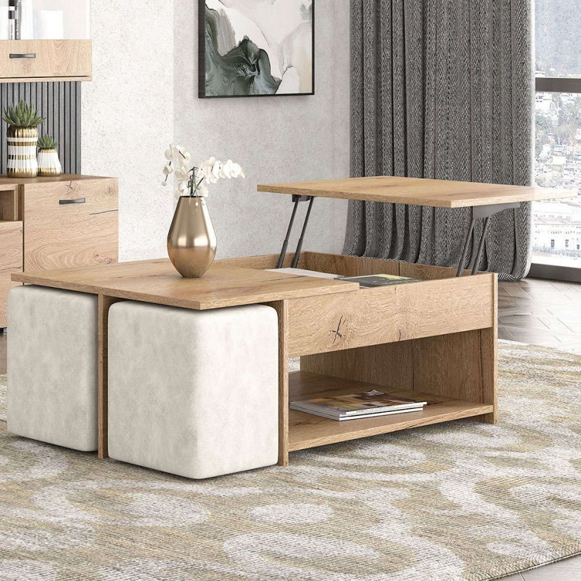 The Living Room Table No6 is the ultimate solution for you, as it perfectly combines functionality with aesthetics. It features a spacious shelf that allows you to store objects and keep your space organized. One of the most impressive features of this table is the two stools that accompany it. These stools fit under the surface of the table when not in use, creating a clean and tidy space. Finally, part of the table's surface can be lifted thanks to the special mechanism it has. The product is delivered unassembled. Quality: Melamine Dimensions: 1 Table: Length: 120 cm, Width: 75 cm, Height: 40 cm