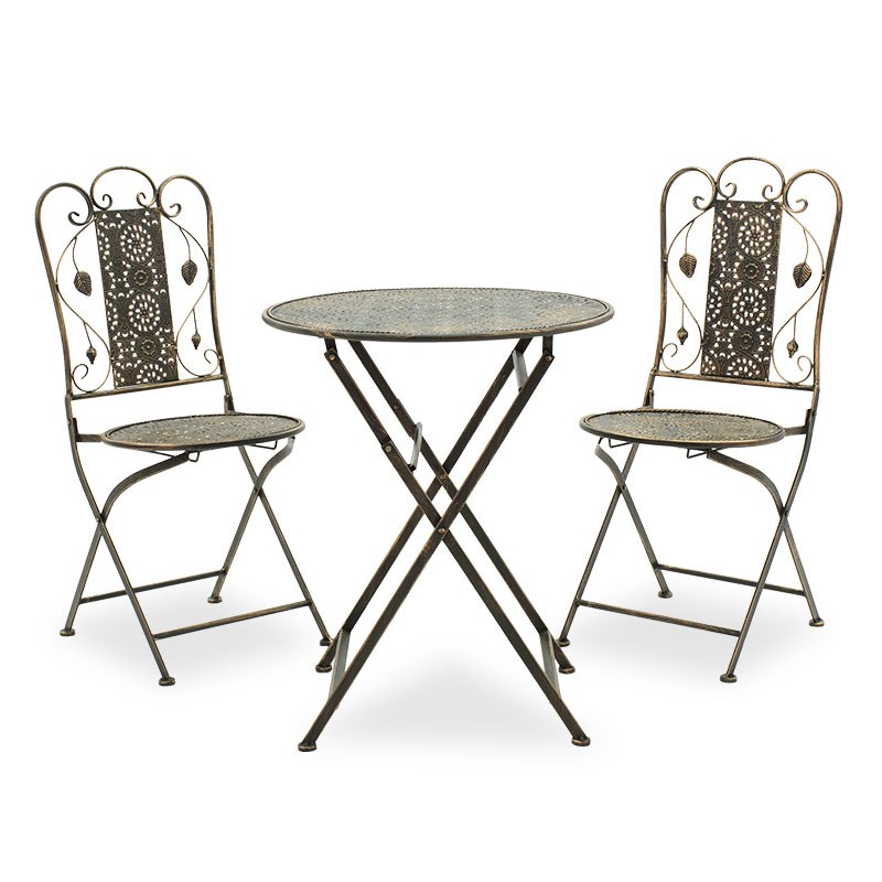 Elegant, simple, and user-friendly, the Garden Dining Set Drill 137-000005 is foldable, making it easy to store and occupying minimal space. It is made of a metal frame in a copper color. The feet have plastic covers to protect the floor. The set is delivered unassembled and assembly instructions are included. A stylish furniture choice for a standout balcony!