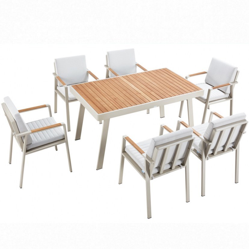 Ανακαλύψτε την ιδανική ισορροπία ανάμεσα στη φυσικότητα και τον σύγχρονο σχεδιασμό με το Σετ Τραπεζαρία Κήπου Nofi 01-00-1748 (7Τμχ) Με Μαξιλάρια, ένα ολοκληρωμένο σετ επτά τεμαχίων που θα μεταμορφώσει κάθε εξωτερικό χώρο σε σημείο συνάντησης και απόλαυσης. Με σκελετό από ανθεκτικό αλουμίνιο σε κομψό μπεζ χρώμα και λεπτομέρειες από φυσικό ξύλο teak, αποπνέει διαχρονικότητα και αυθεντικότητα. Οι έξι πολυθρόνες με μαξιλάρια προσφέρουν εξαιρετική άνεση, ενώ το ευρύχωρο τραπέζι διαστάσεων δημιουργεί τον ιδανικό καμβά για καλοκαιρινά γεύματα και στιγμές χαλάρωσης. Η σειρά Nofi, με την απλότητά της και τα ποιοτικά της υλικά, είναι σχεδιασμένη να καλύψει κάθε απαίτηση με στυλ και λειτουργικότητα.