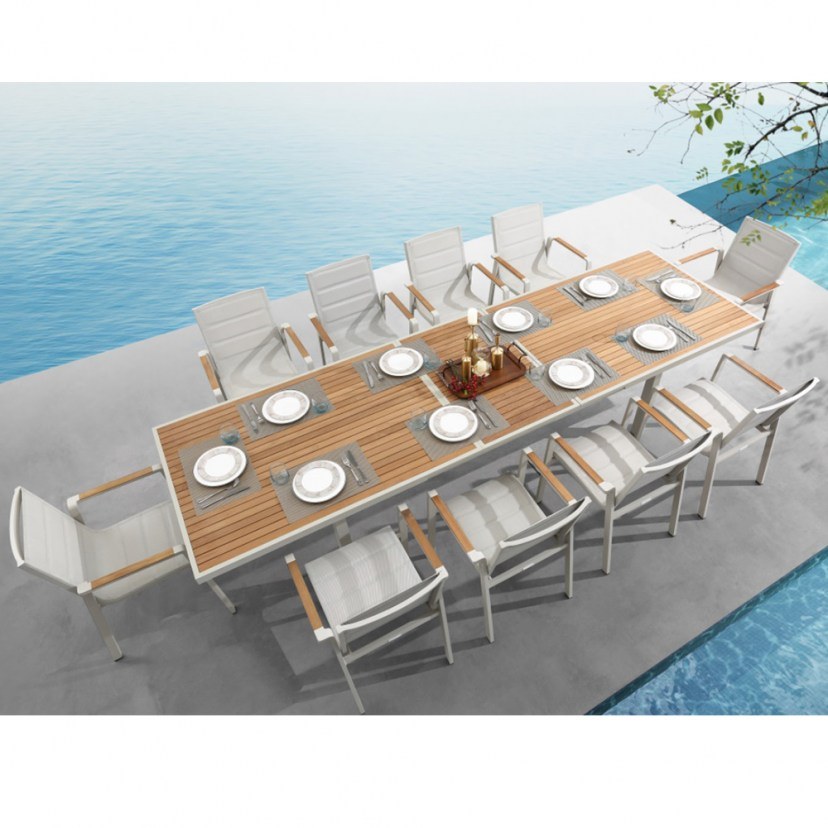 Δώστε στο εξωτερικό σας τραπέζι την προσοχή που του αξίζει με το Σετ Τραπεζαρία Κήπου Nofi 2.0 01-00-2069 (11Τμχ). Ένα επιβλητικό σετ 11 τεμαχίων που συνδυάζει άψογα το minimal design με τη φυσική κομψότητα του ξύλου teak. Οι 10 πολυθρόνες επενδυμένες με textilene εξασφαλίζουν κορυφαία άνεση χωρίς την ανάγκη μαξιλαριών, ενώ το επεκτεινόμενο τραπέζι από 280 έως 340cm προσφέρει απεριόριστη λειτουργικότητα για κάθε περίσταση. Με τον σκελετό αλουμινίου και τα ζεστά ξύλινα στοιχεία, δημιουργείτε έναν χώρο φιλοξενίας που εντυπωσιάζει.