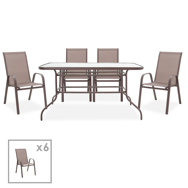 The Garden Dining Set Valor-Calan 200-000320 is ideal for your garden or balcony as it is made of metal, making it durable against time and weather conditions. It consists of six armchairs and a rectangular table. It is constructed with a sturdy metal frame and the main body of the chairs is made of high-quality textilene fabric, which allows the body to 'breathe'. The main surface of the table has tinted glass. The seat height is 43cm. The set is delivered unassembled and assembly instructions are included.