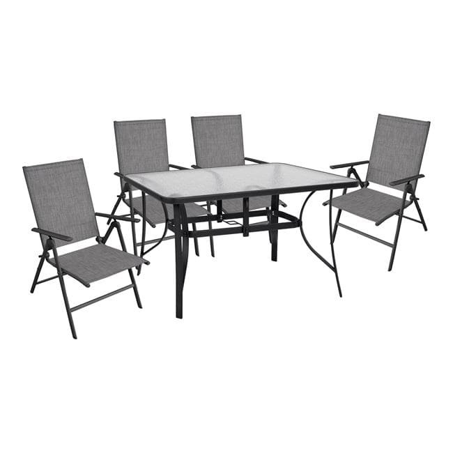 You don't need much to transform your garden or balcony into a paradise ... just a comfortable dining room set, a big umbrella and your favorite cocktail! So choose an umbrella from HM10558.01 and enjoy your favorite drink with your friends. The set includes a metal table with a built -in security glass and four textilene metal chairs. The chairs are foldable for easier transport and storage.