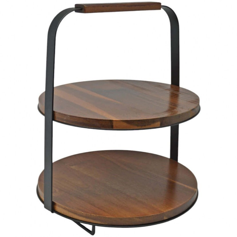 Η Διώροφη Εταζέρα 841516 συνδυάζει την πρακτικότητα με την αισθητική, προσφέροντας μια κομψή λύση για σερβίρισμα ή οργάνωση. Η ξύλινη επιφάνειά της αποπνέει ζεστασιά και φυσική ομορφιά, ενώ ο στιβαρός μεταλλικός σκελετός εξασφαλίζει ανθεκτικότητα και σταθερότητα. Με δύο ευρύχωρα επίπεδα και εργονομική λαβή για εύκολη μεταφορά, αποτελεί ιδανική επιλογή για μπουφέδες, γιορτινά τραπέζια ή ακόμη και για διακόσμηση στον χώρο σας.