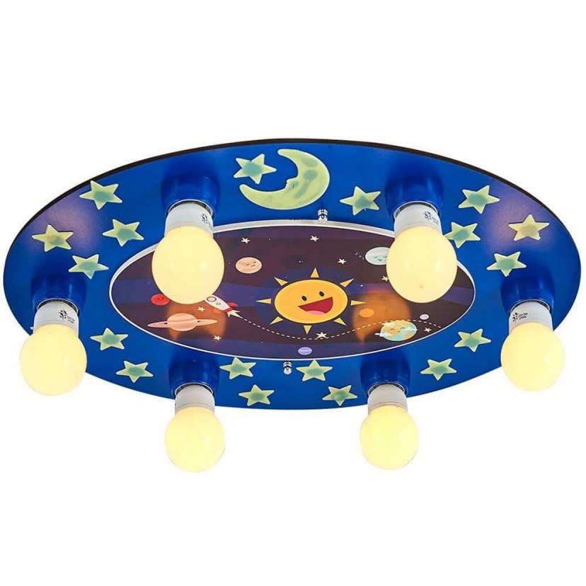 Το Παιδικό Φωτιστικό Οροφής - Πλαφονιέρα 414LRC1548 είναι ιδανική επιλογή για να προσθέσει μαγεία και χαρά στο παιδικό δωμάτιο! Με το παιχνιδιάρικο σχέδιο γεμάτο αστεράκια και σχέδια εμπνευσμένα από το διάστημα, προσφέρει μία αίσθηση περιπέτειας και φαντασίας. Κατασκευασμένη από υψηλής ποιότητας ξύλο, είναι ανθεκτική και ασφαλής για το παιδί σας. Το μοναδικό του σχέδιο φωτίζει τον χώρο με ζεστό και ευχάριστο φως, κάνοντάς το την τέλεια επιλογή για να δημιουργήσετε μια μαγευτική ατμόσφαιρα στον χώρο του παιδιού σας. Απαιτεί έξι λαμπτήρες Ε27 ΜΑΧ 24W, οι οποίοι δεν περιλαμβάνονται στη συσκευασία.