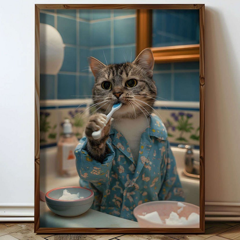 Το Κάδρο856EVL1589 αποτυπώνει με χιουμοριστικό και γλυκό τρόπο μία γάτα με πιτζάμες να βουρτσίζει τα δόντια της. Το σχέδιο αποπνέει μία αίσθηση αθωότητας και παιχνιδιάρικης ζωντάνιας, με τη γάτα να απολαμβάνει τη στιγμή της προσωπικής φροντίδας με μία τρυφερή διάθεση. Κατασκευασμένο από υλικά υψηλής ποιότητας, το κάδρο αυτό δεν είναι μόνο οπτικά ελκυστικό αλλά και ανθεκτικό και μακράς διάρκειας. Η κορνίζα του, φτιαγμένη από MDF και ξύλο πεύκου, εγγυάται ότι θα παραμείνει ένα αγαπημένο και ανθεκτικό στοιχείο στο σπίτι σας για πολλά χρόνια.
