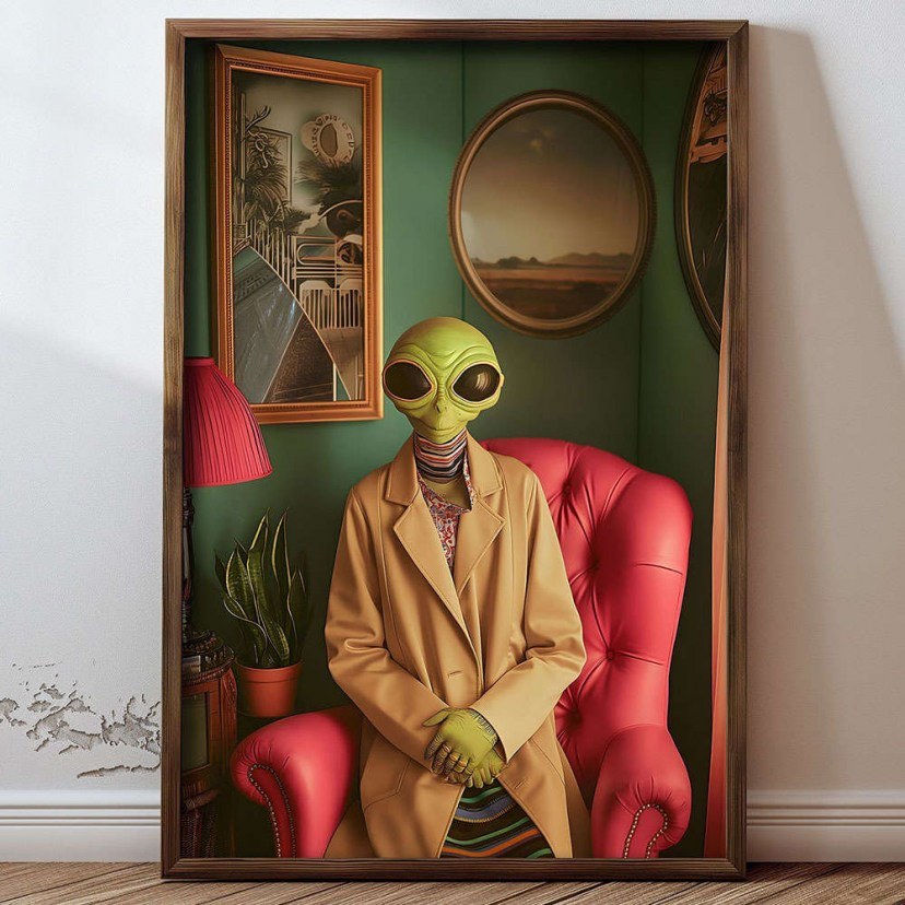 Ανακαλύψτε την απίστευτη φαντασία και τη μοναδικότητα του Κάδρου 856EVL2375, που απεικονίζει μία σουρεαλιστική εικόνα με έναν εξωγήινο να φορά ανθρώπινα ρούχα και να κάθεται σε μια πολυθρόνα ενός κλασικού ανθρώπινου σπιτιού. Αυτό το ιδιαίτερο και εντυπωσιακό κάδρο συνδυάζει την καθημερινότητα με το απρόβλεπτο, δημιουργώντας έναν εκπληκτικό αντίκτυπο στον χώρο σας. Είναι κατασκευασμένο από MDF για εξαιρετική ανθεκτικότητα και εκλεπτυσμένο φινίρισμα και διαθέτει πλαίσιο από ξύλο πεύκου, που του προσδίδει μια ζεστή και φυσική αίσθηση. Η εκτύπωση UV προσφέρει ζωντανά χρώματα και υψηλή ποιότητα εικόνας, εξασφαλίζοντας μακροχρόνια ανθεκτικότητα και εντυπωσιακό οπτικό αποτέλεσμα.