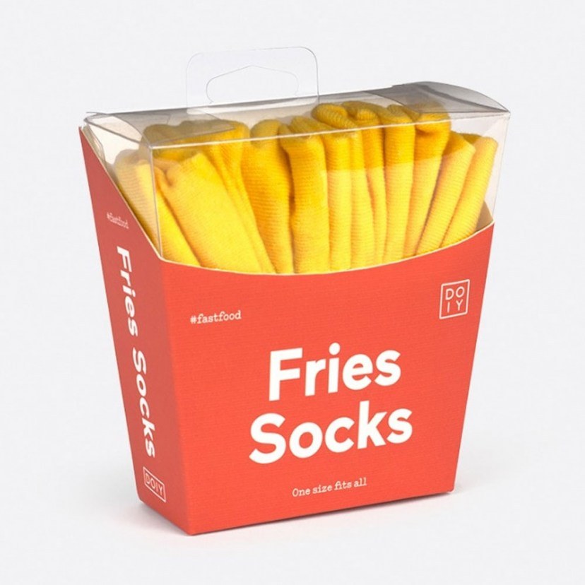 Εντυπωσιάστε τους φίλους σας με το εκκεντρικό στυλ σας επιλέγοντας τις Κάλτσες Τηγανητές Πατάτες DYSOCKSFRI! Πρόκειται για μοντέρνες κάλτσες, με χαρούμενα χρώματα και μοντέρνα μοτίβα! Είναι κατασκευασμένες από ένα κράμα βαμβακιού, πολυεστέρα και ελαστάν. Διατίθενται σε ιδιαίτερη συσκευασία που μοιάζει με κουτί από τηγανητές πατάτες σε φαστφουντάδικο.