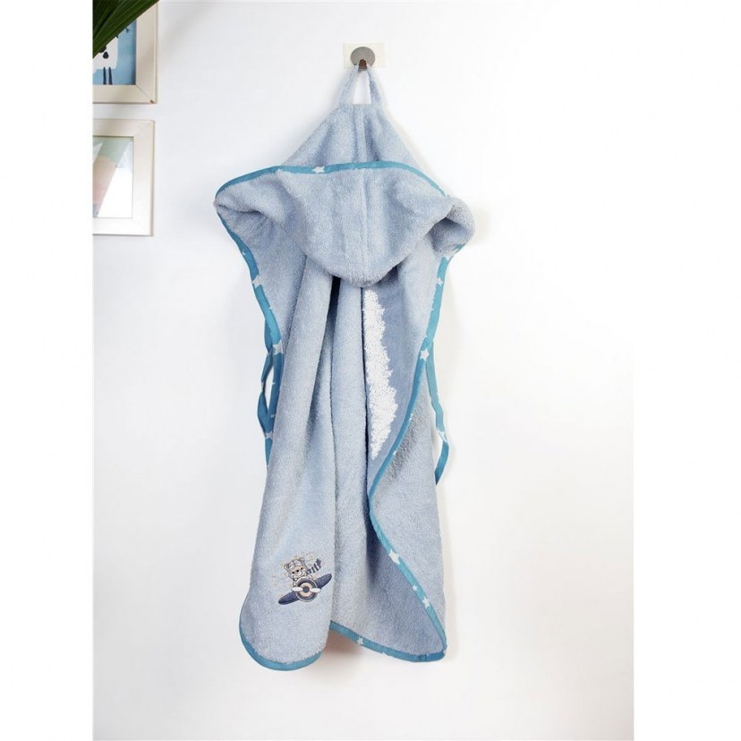 Τυλίξτε το μωρό σας με απαλότητα και φροντίδα μετά το μπάνιο με τη Βρεφική Κάπα Με Κέντημα Aviator, που ξεχωρίζει για το χαριτωμένο κέντημα αεροπόρου και το χρωματιστό ρέλι με μοτίβο αστεράκια που χαρίζει παιχνιδιάρικη διάθεση. Κατασκευασμένη από 100% βαμβακερή, υποαλλεργική πετσέτα υψηλής απορροφητικότητας (400 gr/m²), προσφέρει απαλή αίσθηση και αποτελεσματικό στέγνωμα, ενώ η ενσωματωμένη κουκούλα κρατά το κεφαλάκι του μωρού σας ζεστό. Πιστοποιημένη με OEKO-TEX® Standard 100, αποτελεί ασφαλή και ποιοτική επιλογή για την καθημερινή φροντίδα του μωρού σας.