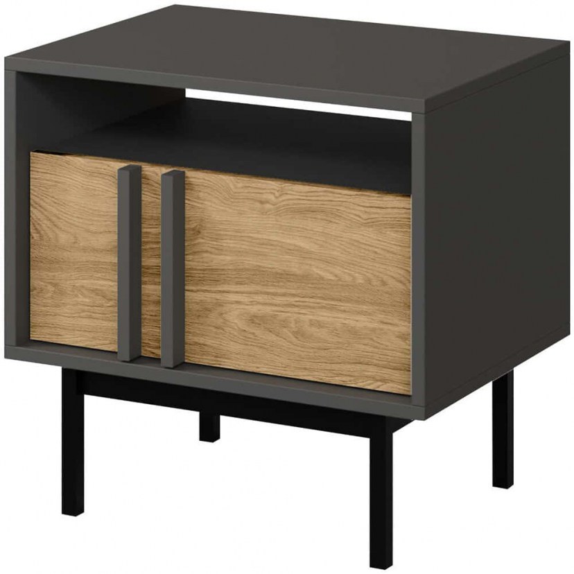 Το Κομοδίνο Alsy Reg προσθέτει κομψότητα και μοντέρνο στυλ στην κρεβατοκάμαρα, με ψηλά πόδια και αρμονική σχεδίαση που ταιριάζει με κάθε τύπο κρεβατιού. Διαθέτει ένα πρακτικό συρτάρι και ράφι για εύκολη αποθήκευση, ενώ η στιβαρή κατασκευή από μοριοσανίδα πάχους 16 mm, μεταλλικό πλαίσιο και HDF πλάτη εξασφαλίζει αντοχή και ποιότητα. Το προϊόν παραδίδεται αμοντάριστο, σε εργοστασιακή συσκευασία.