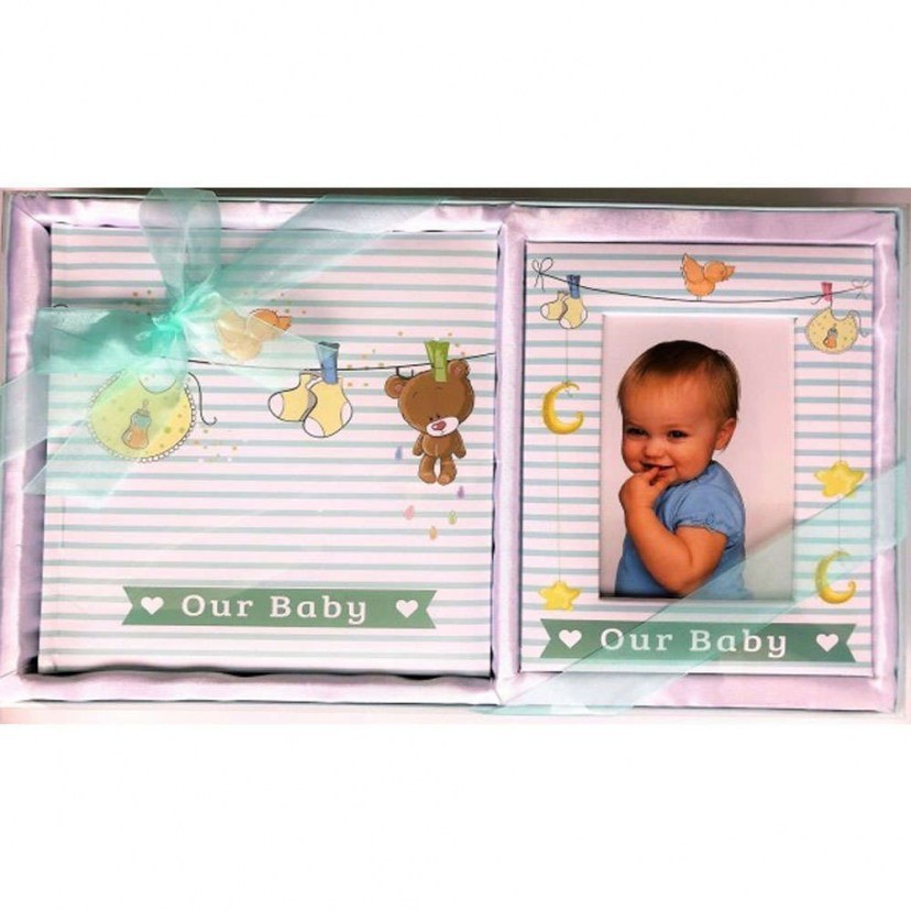 Το Παιδικό Σετ Κορνίζα Με Άλμπουμ (2Τμχ) YM534240102 σχεδιάστηκε για να σας βοηθήσει να διατηρήσετε ζωντανές τις σημαντικότερες και πιο γλυκές στιγμές του μωρού σας. Διαθέτει χαριτωμένα σχέδια και επιγραφή «Our Baby». Το σετ αποτελείται από ένα άλμπουμ για φωτογραφίες και από μία κορνίζα.