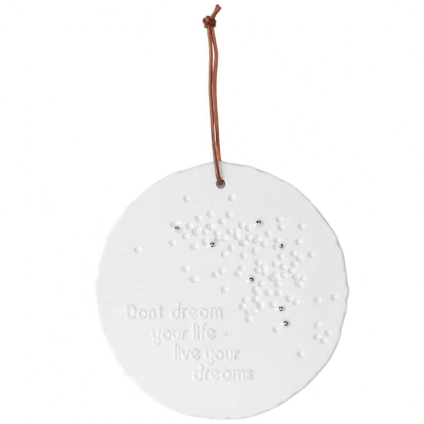 Εμπνευστείτε καθημερινά με το Κρεμαστό Διακοσμητικό Don't Dream Your Life RD0017858. Κατασκευασμένο από πορσελάνη με ματ φινίρισμα και ανάγλυφο σχέδιο, φέρει το μήνυμα "Don't dream your life, live your dreams", προσθέτοντας θετική ενέργεια και αισιοδοξία στον χώρο σας. Ιδανικό για τοίχους σαλονιού, υπνοδωματίου ή γραφείου, λειτουργεί ως όμορφο και εντυπωσιακό διακοσμητικό στοιχείο που εμπνέει καθημερινά.