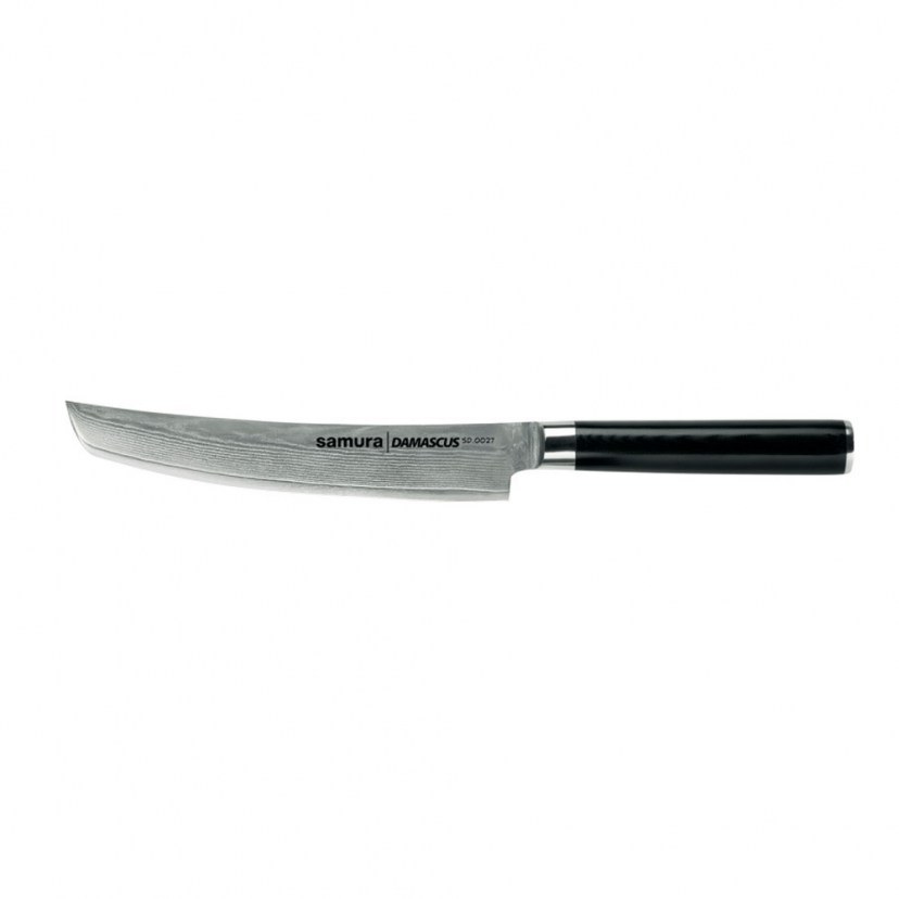 Κάντε δικό σας το Μαχαίρι Γενικής Χρήσης SD-0027 Tanto Damascus και θα το λατρέψετε για την ποιότητα και την αποδοτικότητά του. Είναι ένα πολυεργαλείο για κάθε κουζίνα, καθώς διαθέτει λεπίδα με άκρο Tanto, που το καθιστά ιδανικό για το κόψιμο και το τεμάχισμα όλων των τροφίμων, όπως φρούτα, λαχανικά, ψωμί, κρεατικά, θαλασσινά και ψάρια (χωρίς κόκαλα). Επιπλέον, λόγω της ίσιας και λεπτής λεπίδας του είναι κατάλληλο και για την παρασκευή σούσι. Η σειρά μαχαιριών Damascus αποτελείται από μαχαίρια με λεπίδες από δαμασκηνό ατσάλι 67 στρώσεων, που τα καθιστά αιχμηρά και ανθεκτικά. Οι εργονομικές λαβές των μαχαιριών είναι κατασκευασμένες από υψηλής πίεσης fiberglass, G-10 και διαθέτουν ειδικό αντιμικροβιακό, ανοξείδωτο κολάρο. Τα μαχαίρια αυτά συνδυάζουν την παραδοσιακή τέχνη κατασκευής ιαπωνικών μαχαιριών, το υψηλής αισθητικής, σύγχρονο και κομψό design με τα εξαιρετικής ποιότητας μέταλλα, κάνοντάς τα την αγαπημένη επιλογή πολλών επαγγελματιών σεφ.