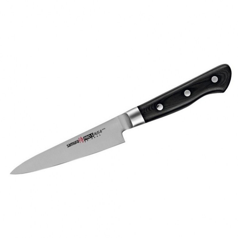 Το Μαχαίρι Γενικής Χρήσης SP-0021 PRO-S είναι απαραίτητο για κάθε κουζίνα, καθώς είναι ιδανικό για να κόβετε όλα τα τρόφιμα όπως λαχανικά, φρούτα, μυρωδικά, ψωμί, τυριά, κρέατα και ψάρια (χωρίς κόκαλα). Η σειρά PRO-S αποτελείται από μαχαίρια με λεπίδες κατασκευασμένες από ανοξείδωτο ατσάλι AUS-8, με μαύρες λαβές ευρωπαϊκού τύπου με πριτσίνια. Αυτός ο συνδυασμός προσφέρει άψογη συνδυασμό της ιαπωνικής ποιότητας, της άνεσης και του ιδανικού βάρους ισορροπίας. Οι λαβές είναι σχεδιασμένες από υψηλής πίεσης fiberglass G-10 και διαθέτουν αντιμικροβιακό, μεταλλικό κολάρο που προστατεύει τα τρόφιμα από τα βακτήρια. Αυτά τα χαρακτηριστικά θα σας βοηθήσουν να αναδείξετε τις δεξιότητές σας και να βελτιώσετε τις αποδόσεις σας στην κουζίνα.