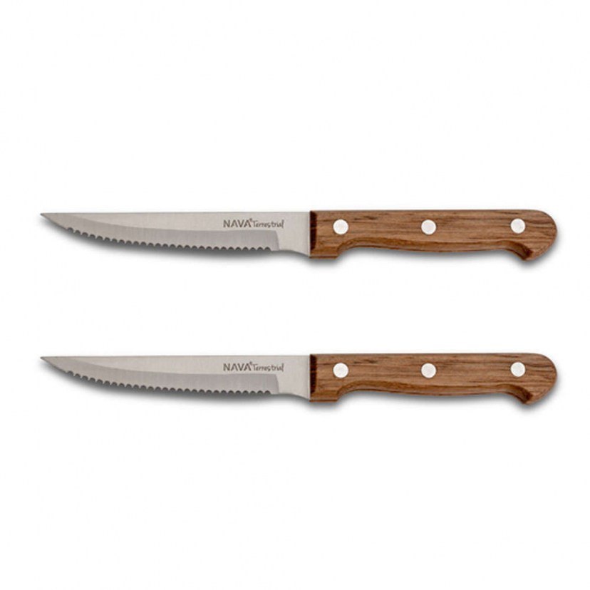 Το Σετ Μαχαίρια Κρέατος Terrestrial 10-058-047 περιλαμβάνει δύο οδοντωτά μαχαίρια, τα οποία είναι ιδανικά για να τεμαχίσετε και να κόψετε κρέας. Πρόκειται για δύο πρακτικά και ποιοτικά μαχαίρια, τα οποία είναι κατασκευασμένα από ανοξείδωτο ατσάλι και διαθέτουν εργονομική λαβή από ξύλο.