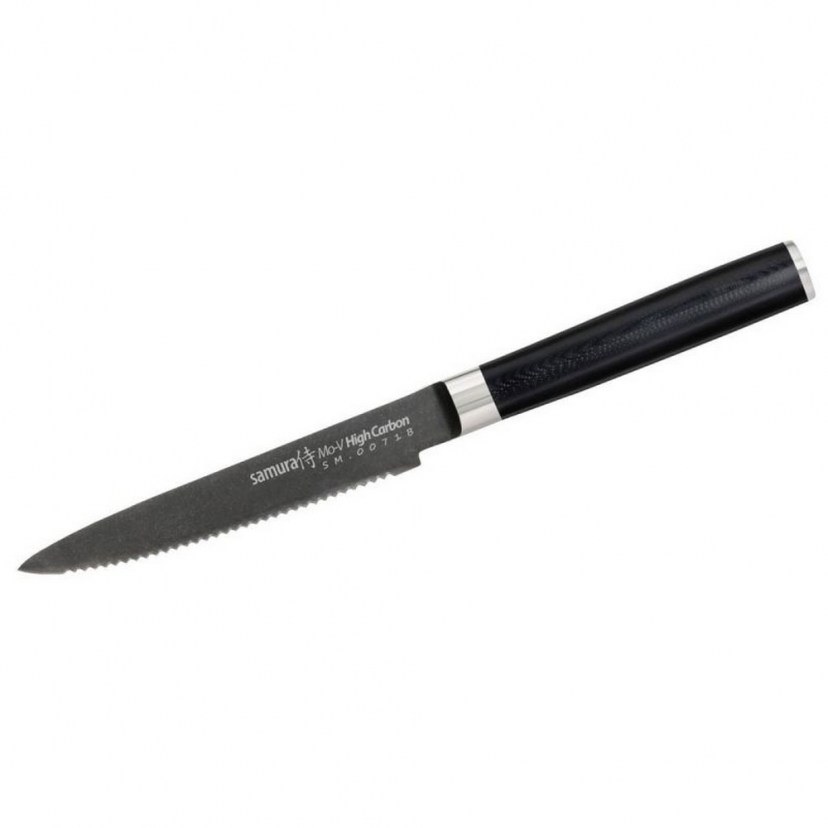 Κάντε δικό σας το Μαχαίρι Ντομάτας MO-V Stonewash SM-0071B και θα μείνετε απόλυτα ικανοποιημένοι με την ποιότητα και την αποδοτηκότητά του. Προσφέρει ακρίβεια και άνεση στην κοπή τροφίμων με σκληρό εξωτερικό περίβλημα και μαλακό εσωτερικό, όπως η ντομάτα, τα κεράσια, τα ακτινίδια και τα σταφύλια. Η σειρά μαχαιριών MO-V STONEWASH διαθέτει λεπίδες εξαιρετικής αντοχής και αιχμηρότητας. Οι εργονομικές λαβές με οβάλ σχήμα προσφέρουν σταθερό κράτημα και κατασκευάζονται από υψηλής πίεσης fiberglass και G-10, ενώ το ειδικό αντιμικροβιακό, ανοξείδωτο κολάρο ενισχύει την υγιεινή τους. Οι λεπίδες είναι κατασκευασμένες από μονής στρώσης ανοξείδωτο ατσάλι ενισχυμένο με μολυβδαίνιο-βανάδιο, διαθέτουν ματ υφή και παραμένουν αιχμηρές με την πάροδο του χρόνου, ενώ δεν κολλάνε τρόφιμα πάνω τους. Ο συνδυασμός της παραδοσιακής τεχνογνωσίας και του μοντέρνου design καθιστά αυτή τη σειρά μαχαιριών ένα απαραίτητο εργαλείο στην κουζίνα κάθε επαγγελματία σεφ ή ερασιτέχνη μάγειρα.