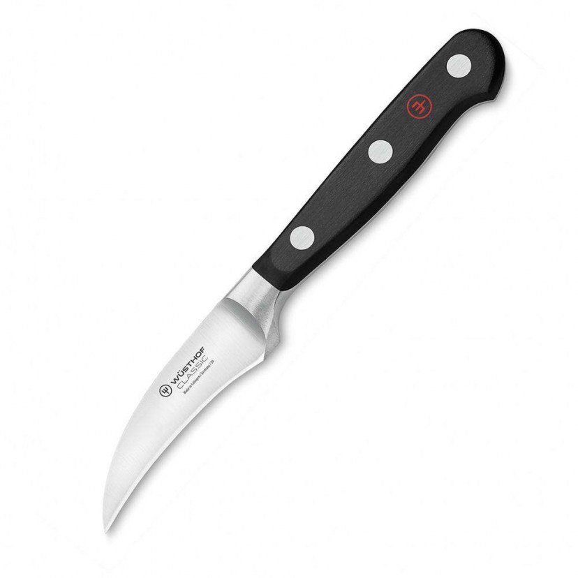 ΤοΜαχαίρι Ξεφλουδίσματος Classic 1040102207 είναι γνωστό και ως παπαγαλάκι ή ως μαχαίρι περιστροφής ή Tourne. Πρόκειται για ένα έξυπνο μαχαίρι, το οποίο είναι ιδανικό για το ξεφλούδισμα, το σκάλισμα και τον καθαρισμό στρογγυλεμένων λαχανικών και φρούτων και για άλλες μικροδουλειές κατά την προετοιμασία των γαστρονομικών σας δημιουργιών. Διαθέτει μικρή, κυρτή λεπίδα σε σχήμα ράμφους, που το καθιστά εύχρηστο, ασφαλές και εργονομικό στο ξεφλούδισμα πατάτας, μήλου και άλλων φρούτων και λαχανικών. Είναι ιδανικό και για εσάς που θέλετε να δώσετε ιδιαίτερο σχήμα σε φρούτα και λαχανικά που λειτουργούν ως decor για το πιάτο ή μία πιατέλα σε μπουφέ. Αυτό το εκπληκτικό μαχαίρι διακρίνεται για την υψηλής ποιότητας λάμα από μονοκόμματο κομμάτι χειρουργικού ατσαλιού που περιέχει χρώμιο-μόλυβδο-βανάδιο (X50 Cr MoV 15), γεγονός που το καθιστά ανθεκτικό και κοφτερό. Διαθέτει εργονομική λαβή με τρία πριτσίνια και ολόκληρο (full bolster) στήθωμα (ένωση λάμας με λαβή) για περισσότερη ασφάλεια και προστασία. Είναι ακονισμένο με πατενταρισμένη από τη WUSTHOF PeTeC.
