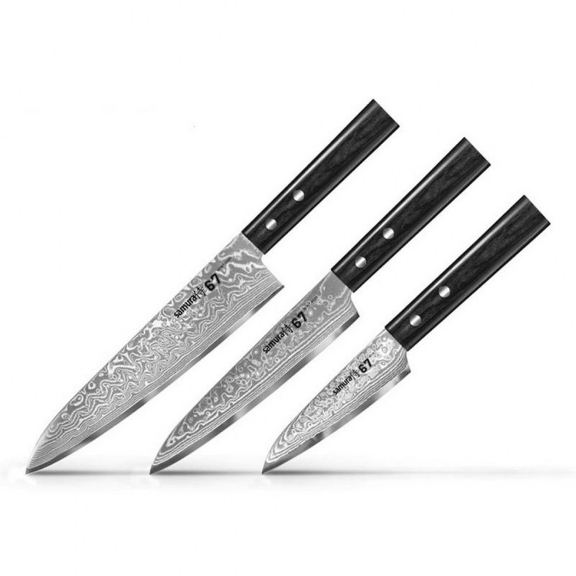 Το Σετ Μαχαιριών Damascus 67 SD67-0220M αντιπροσωπεύει τη συνύπαρξη της υψηλής τέχνης και της λειτουργικότητας στην κουζίνα. Σχεδιασμένο για επαγγελματίες και ερασιτέχνες μάγειρες, αυτό το σετ προσφέρει μια εμπειρία κοπής που υπερβαίνει τις προσδοκίες. Κάθε μαχαίρι στο σετ διαθέτει εξαιρετικό design που ενώνει την παράδοση και το μοντέρνο, δημιουργώντας ένα αισθητικά εντυπωσιακό εργαλείο. Ο πυρήνας της λεπίδας από ανοξείδωτο ατσάλι VG-10 παρέχει υψηλή σκληρότητα και αντοχή. Κάθε λεπίδα διαθέτει 67 στρώσεις, προσφέροντας εξαιρετική αιχμηρότητα και αντοχή στη διάβρωση. Το σετ περιλαμβάνει ένα μαχαίρι Chef για κοψίματα και τεμαχισμούς με ακρίβεια, ένα μαχαίρι κουζίνας που είναι ιδανικό για γενική χρήση και ένα μαχαίρι ξεφλουδίσματος με ευέλικτο για καθαρισμό φρούτων και κοπή λαχανικών. Οι λαβές είναι εργονομικά σχεδιασμένες για τέλεια ισορροπία και άνεση κατά τη χρήση. Η συνδυασμένη ακρίβεια και έλεγχος κατά το κόψιμο εξασφαλίζουν επαγγελματικά αποτελέσματα.