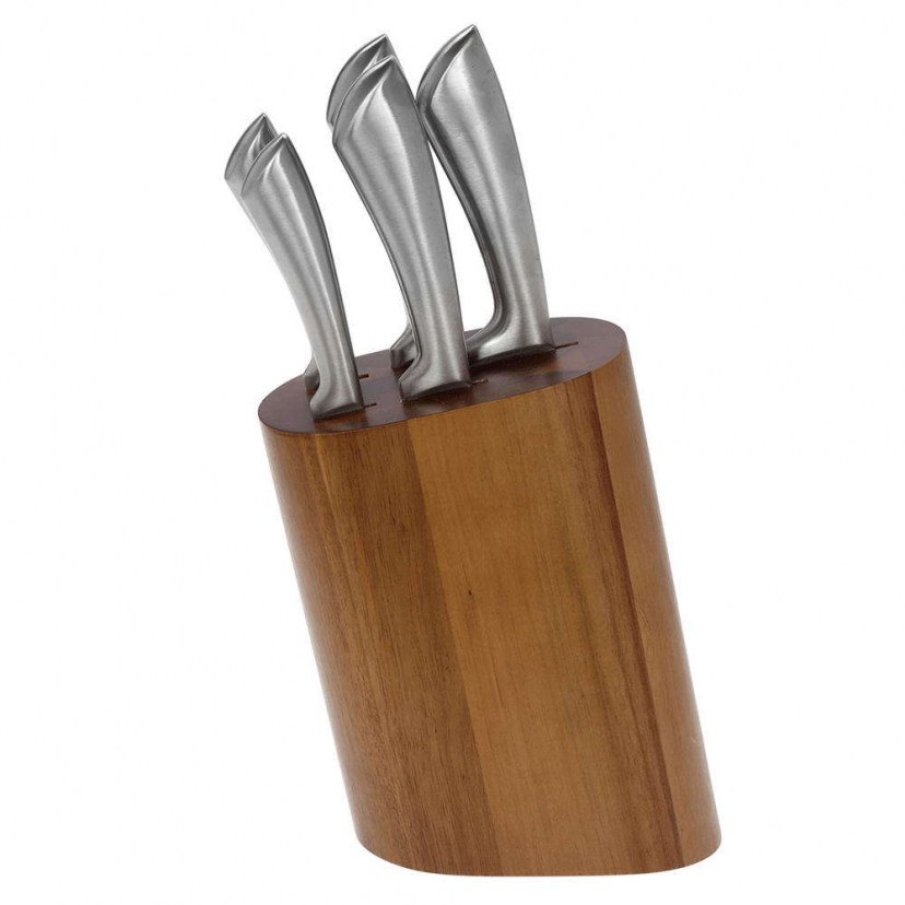 Το Σετ Μαχαίρια Με Βάση 01.00.633 είναι ιδανικό για την κουζίνα της οικίας ή του επαγγελματικού σας χώρου. Πρόκειται για ένα ποιοτικό σετ, το οποίο περιλαμβάνει πέντε μαχαίρια (ένα μαχαίρι σεφ, ένα μαχαίρι ψωμιού, ένα μαχαίρι ξεκοκαλίσματος, ένα μαχαίρι γενικής χρήσης και ένα μαχαίρι ξεφλουδίσματος), ώστε να καλύψει κάθε σας ανάγκη. Χάρη στην εργονομική βάση από ξύλο ακακίας τα διατηρείτε οργανωμένα και εξασφαλίζετε ασφάλεια στην κουζίνα σας και μεγαλύτερη διάρκεια ζωής στα μαχαίρια. Τα μαχαίρια διαθέτουν ανοξείδωτη λεπίδα 4CR14 και εργονομική λαβή από ανοξείδωτο ατσάλι 18/10.