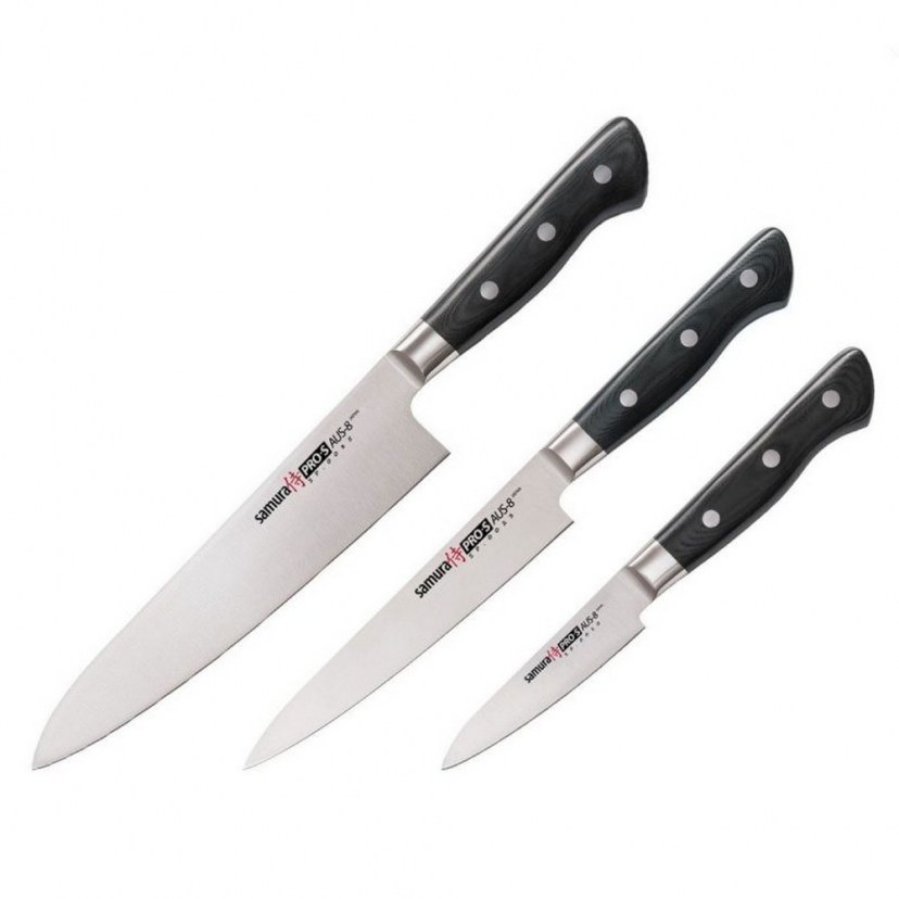 Το Σετ Μαχαιριών PRO-S SP-0220 είναι η ιδανική επιλογή για εσάς που αναζητάτε αξιόπιστα, ευέλικτα και ανθεκτικά μαχαίρια για την κουζίνα σας. Αυτό το σετ περιλαμβάνει τρία μαχαίρια, καλύπτοντας έτσι κάθε εργασία που έχετε στο μυαλό σας στην κουζίνα. Περιλαμβάνει ένα μαχαίρι ξεφλουδίσματος με μικρή, ακριβή λεπίδα που επιτρέπει εύκολο και ακριβές κόψιμο και το καθιστά ιδανικό για το ξεφλούδισμα φρούτων και λαχανικών. Επίσης διαθέτει ένα μαχαίρι γενικής χρήσης που είναι κατάλληλο για τον τεμαχισμό φρούτων, λαχανικών και τυριών και ένα μαχαίρι Του Chef το οποίο είναι ιδανικό για την κοπή και τον τεμαχισμό ψαριών, κρέατος και λαχανικών. Οι λεπίδες κατασκευάζονται από ανοξείδωτο ατσάλι AUS-8, παρέχοντας κοφτερό και ανθεκτικό κόψιμο. Οι λαβές κατασκευάζονται από υψηλής πίεσης fiberglass G-10, εξασφαλίζοντας σταθερό κράτημα και ανθεκτικότητα. Τα μαχαίρια διαθέτουν μεταλλικό κολάρο με αντιμικροβιακές ιδιότητες, προστατεύοντας τα τρόφιμα από βακτήρια.