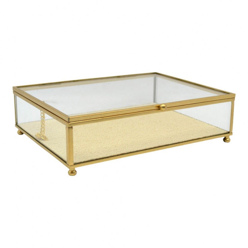 Η Μπιζουτιέρα - Κουτί Αποθήκευσης Κοσμημάτων 834624 συνδυάζει λειτουργικότητα και κομψότητα με τον υπέροχο σχεδιασμό της. Κατασκευασμένη από διάφανο γυαλί και λαμπερό μεταλλικό πλαίσιο, προσφέρει μια πολυτελή και μοντέρνα αίσθηση, ιδανική για να αποθηκεύσετε τα κοσμήματά σας ή άλλα μικρά αντικείμενα. Το διαφανές γυαλί επιτρέπει να βλέπετε εύκολα τα περιεχόμενα, ενώ το χρυσό πλαίσιο προσθέτει μία πινελιά πολυτέλειας στον χώρο σας.