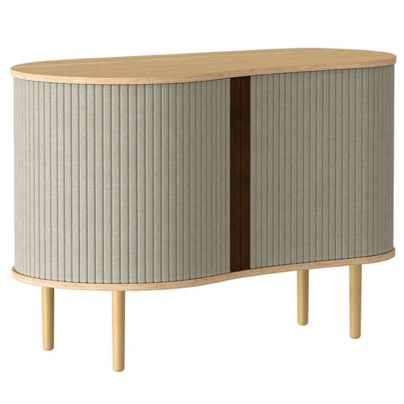 O Μπουφές Audacious Horizons S διαθέτει ειδικές πόρτες που γλιστρούν γύρω από την άκρη του ντουλαπιού, επιτρέποντάς σας να επιλέξετε πόσο από το εσωτερικό θέλετε να εμφανίσετε. Είναι κατασκευασμένος από μασίφ ξύλο δρυός και MDF, ενώ τα ντουλάπια είναι επενδυμένα με ειδικά επεξεργασμένο ύφασμα που προέρχεται από ανακυκλωμένα μπουκάλια. Το προϊόν παραδίδεται αμοντάριστο.