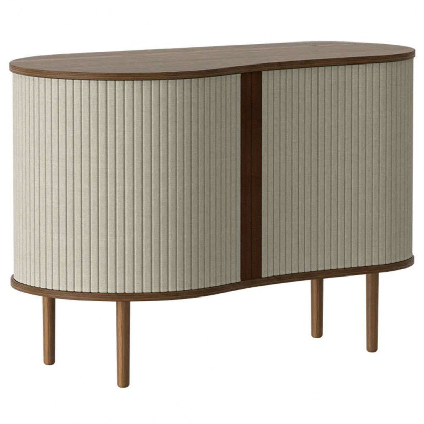 O Μπουφές Audacious Horizons S διαθέτει ειδικές πόρτες που γλιστρούν γύρω από την άκρη του ντουλαπιού, επιτρέποντάς σας να επιλέξετε πόσο από το εσωτερικό θέλετε να εμφανίσετε. Είναι κατασκευασμένος από μασίφ ξύλο δρυός και MDF, ενώ τα ντουλάπια είναι επενδυμένα με ειδικά επεξεργασμένο ύφασμα που προέρχεται από ανακυκλωμένα μπουκάλια. Το προϊόν παραδίδεται αμοντάριστο.