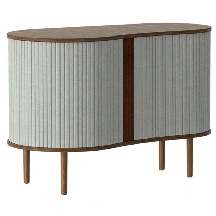 O Μπουφές Audacious Horizons S διαθέτει ειδικές πόρτες που γλιστρούν γύρω από την άκρη του ντουλαπιού, επιτρέποντάς σας να επιλέξετε πόσο από το εσωτερικό θέλετε να εμφανίσετε. Είναι κατασκευασμένος από μασίφ ξύλο δρυός και MDF, ενώ τα ντουλάπια είναι επενδυμένα με ειδικά επεξεργασμένο ύφασμα που προέρχεται από ανακυκλωμένα μπουκάλια. Το προϊόν παραδίδεται αμοντάριστο.
