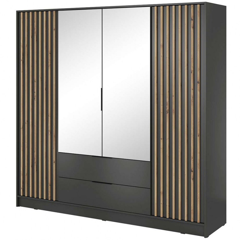 Η Τετράφυλλη Ντουλάπα Nolan συνδυάζει μοντέρνο σχεδιασμό με εξαιρετική λειτουργικότητα, προσφέροντας άφθονους αποθηκευτικούς χώρους για το σαλόνι ή την κρεβατοκάμαρά σας. Διαθέτει ντουλάπι με ράγα για κρεμαστά ρούχα στο κέντρο, ενώ στα δεξιά και αριστερά της ντουλάπας υπάρχουν ντουλάπια με τέσσερα ράφια το καθένα, παρέχοντας οργανωμένο αποθηκευτικό χώρο. Περιλαμβάνει επίσης δύο συρτάρια για επιπλέον αποθήκευση μικροαντικειμένων. Ο καθρέπτης στο εξωτερικό μέρος ενισχύει τη λειτουργικότητα της ντουλάπας, ενώ η κατασκευή της από μοριοσανίδα πάχους 16mm με επένδυση ABS 0.5mm εξασφαλίζει ανθεκτικότητα και ποιότητα. Τα μεταλλικά χερούλια και τα διακοσμητικά πηχάκια ABS 1.8x1.8 mm ολοκληρώνουν το μοντέρνο και κομψό σχέδιο. Η ντουλάπα Nolan είναι Ευρωπαϊκής προέλευσης, διασφαλίζοντας υψηλά πρότυπα κατασκευής και αντοχής. Το προϊόν παραδίδεται αμοντάριστο.