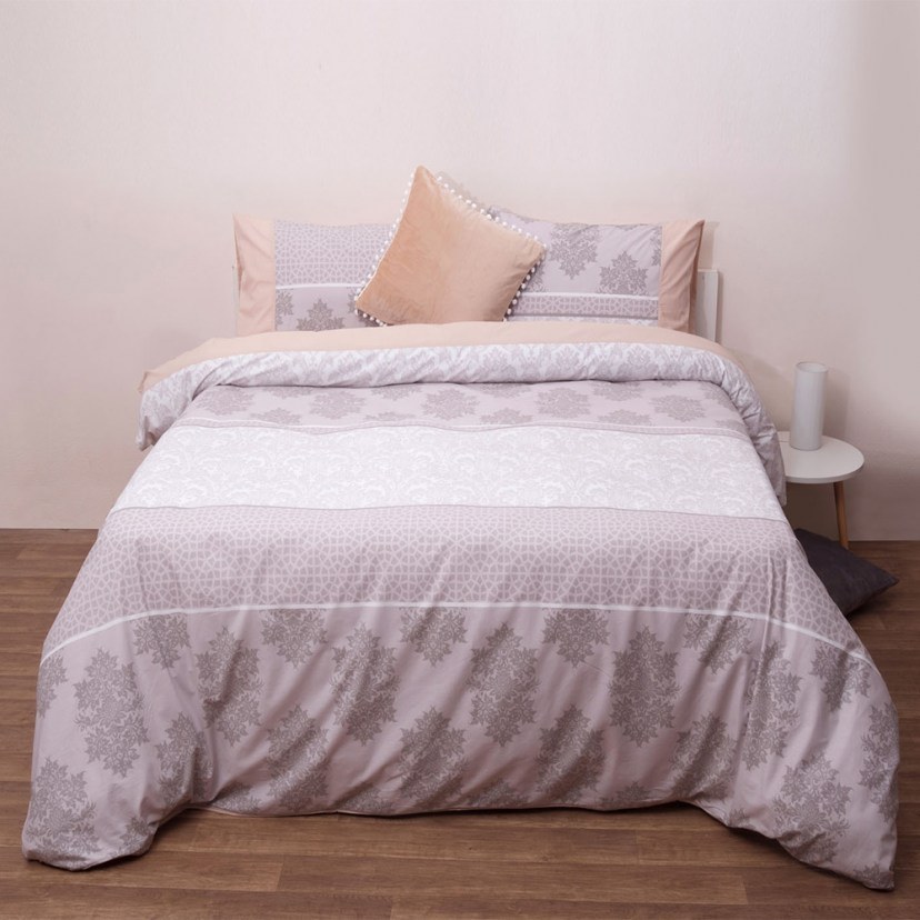 Το Σετ Πάπλωμα Dream 7007 είναι μία μοντέρνα επιλογή, που θα εξασφαλίσει φινέτσα και ομορφιά στο υπνοδωμάτιό σας! Πρόκειται για σετ διπλής όψης, το οποίο στη μία πλευρά φέρει το σχέδιο του πανωσέντονου και στην άλλη του κατωσέντονου. Είμαι κατασκευασμένο από βαμβακερό περκάλι ύφασμα, το οποίο το καθιστά ανθεκτικό στο χρόνο και στη χρήση και ευχάριστο στην υφή. Το πάπλωμα διαθέτει πλούσια γέμιση πολυεστερικής βάτας, που το καθιστά αφράτο και ζεστό.
