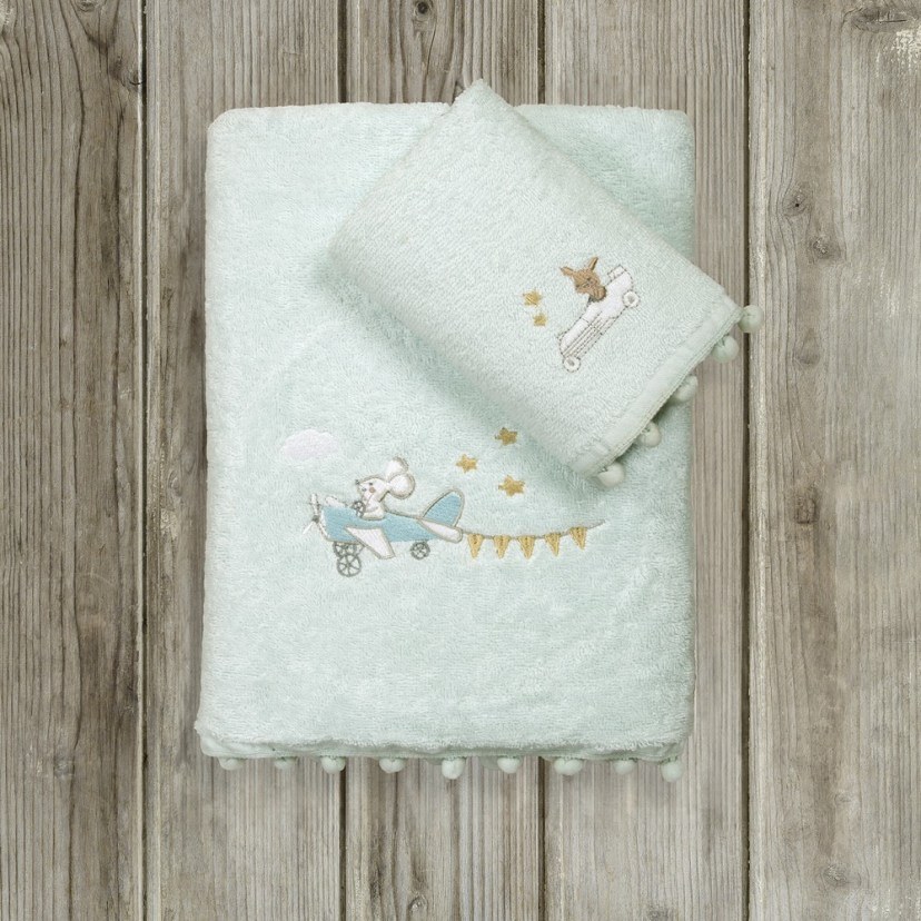 Ανακαλύψτε το Σετ Παιδικές Πετσέτες Joy Ride (2τμχ), κατασκευασμένο από 100% βαμβάκι για απαλή, φυσική αίσθηση που αγκαλιάζει το μωρό σας και το στεγνώνει με ασφάλεια μετά το μπάνιο. Η υποαλλεργική σύνθεση και οι στρογγυλεμένες γωνίες προσφέρουν μέγιστη προστασία στην ευαίσθητη επιδερμίδα, ενώ η υψηλή απορροφητικότητα εξασφαλίζει γρήγορο στέγνωμα. Το παιχνιδιάρικο κεντητό σχέδιο με χαριτωμένο ποντικάκι σε αεροπλανάκι, διακοσμητικά σημαιάκια, χρυσαφένιους αστερισμούς και αφράτα σύννεφα ζωντανεύει το μπάνιο του μωρού σας, ενώ τα πομ πομ στο τελείωμα προσθέτουν μια γλυκιά, χαριτωμένη πινελιά.