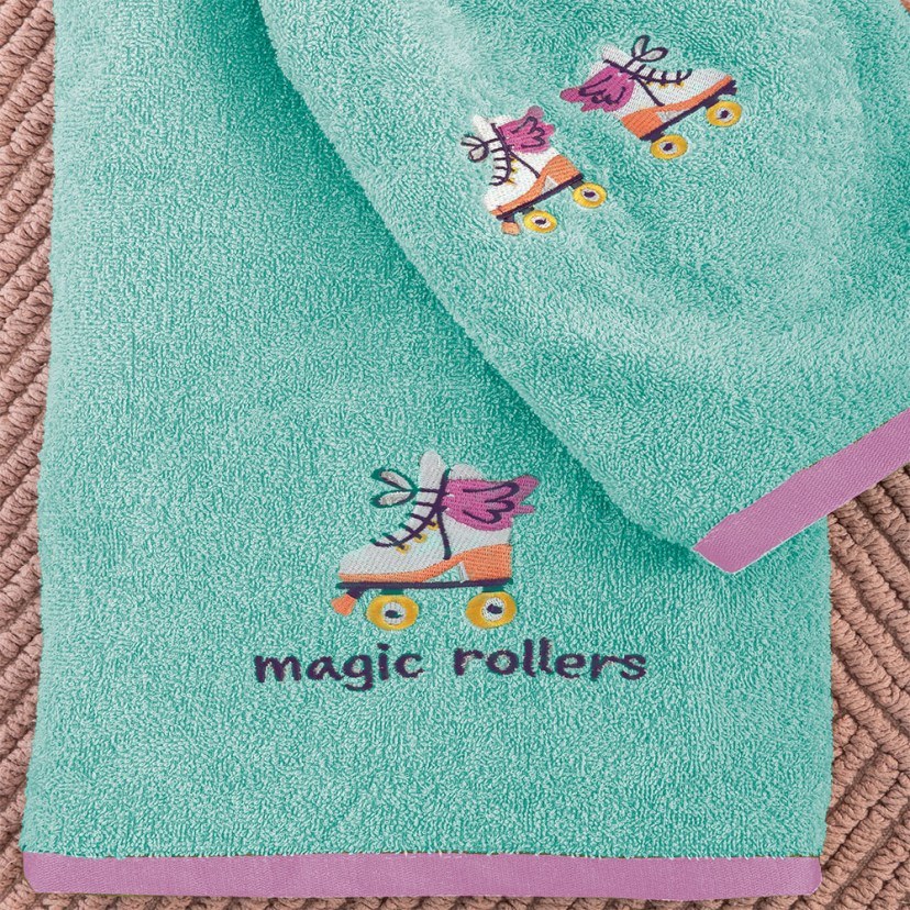 Χαρίστε την απαραίτητη φροντίδα στην κορούλα σας με το Σετ Παιδικές Πετσέτες Rollers (2τμχ). Διαθέτει χαριτωμένα κεντητά σχέδια με ρόλερς και διατίθεται σε υπέροχο χρωματισμό, που θα ξετρελάνει τη μικρή σας. Φτιαγμένο από 100% βαμβάκι υψηλής ποιότητας 380gsm, προσφέρει απαλή υφή και εξαιρετική απορροφητικότητα. Το σετ περιλαμβάνει μία πετσέτα προσώπου και μία πετσέτα σώματος. Πλένεται στους 30°C και σιδερώνεται σε μέτρια θερμοκρασία. Απαγορεύεται το στεγνωτήριο, το στεγνό καθάρισμα και η χρήση ισχυρού λευκαντικού και χλωρίου.