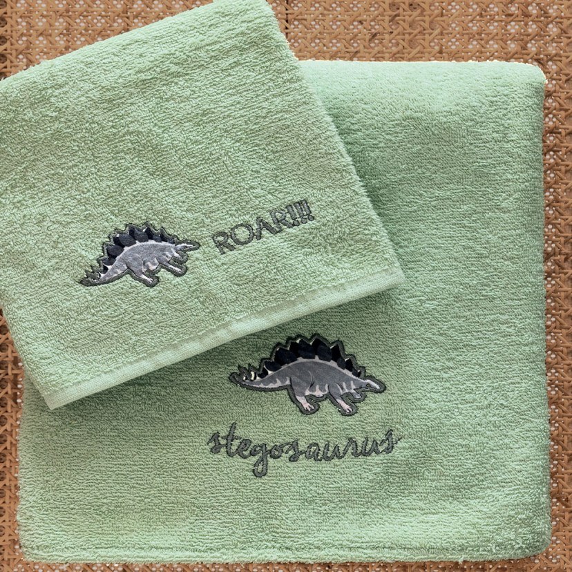 Οι δεινόσαυροι πάντα εντυπωσιάζουν τους μικρούς μας φίλους, για αυτό επιλέξτε το Σετ Παιδικές Πετσέτες Stego (2τμχ) και κάντε το παιδί σας να ξετρελαθεί! Φέρει όμορφα κεντημένα σχέδια με δεινόσαυρους και επιγραφές. Κατασκευασμένο από 100% βαμβακερό ύφασμα υψηλής ποιότητας 380gsm, προσφέρει μοναδική απορροφητικότητα και εξαιρετικά απαλή αίσθηση στο παιδικό δέρμα. Το σετ περιλαμβάνει μία πετσέτα προσώπου και μία πετσέτα σώματος. Πλένεται στους 30°C και σιδερώνεται σε μέτρια θερμοκρασία. Απαγορεύεται το στεγνωτήριο, το στεγνό καθάρισμα και η χρήση ισχυρού λευκαντικού ή χλωρίου.