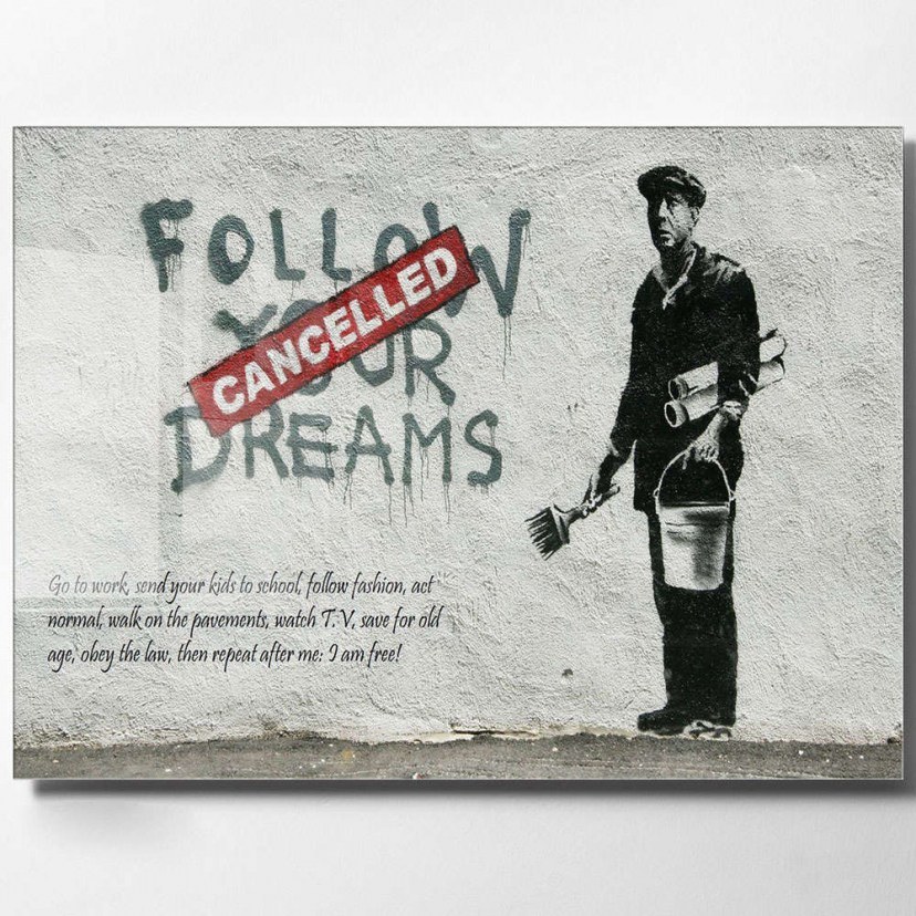 Ο Γυάλινος Πίνακας681BRS1311 είναι εμπνευσμένος από το διάσημο έργο Follow Your Dreams του καλλιτέχνη Banksy. Αυτό το έργο τέχνης αποτυπώνει ένα ισχυρό μήνυμα που αναδεικνύει την αντίφαση ανάμεσα στις φιλοδοξίες και την πραγματικότητα. Στον πίνακα απεικονίζεται ένας άνδρας που κρατά μια βούρτσα και έναν κουβά, στεκόμενος δίπλα σε μια πινακίδα. Η πινακίδα φέρει το χέρι που γράφει «ακολουθήστε τα όνειρά σας», μεταφέροντας ένα μήνυμα αισιοδοξίας και ελπίδας. Πιο εντυπωσιακή είναι η κόκκινη σφραγίδα που λέει «ακυρώθηκε», υποδεικνύοντας την απογοήτευση και τις προκλήσεις που συχνά συνδέονται με την επίτευξη των ονείρων μας. Κατασκευασμένος από 100% σκληρυμένο γυαλί, ο πίνακας αυτός διασφαλίζει τη μακροχρόνια ανθεκτικότητα και την ασφάλεια στον χώρο σας. Το πάχος 4 mm προσφέρει επιπλέον προστασία, καθώς το σκληρυμένο γυαλί θρυμματίζεται σε μικρά, ακίνδυνα κομμάτια σε περίπτωση σπασίματος.