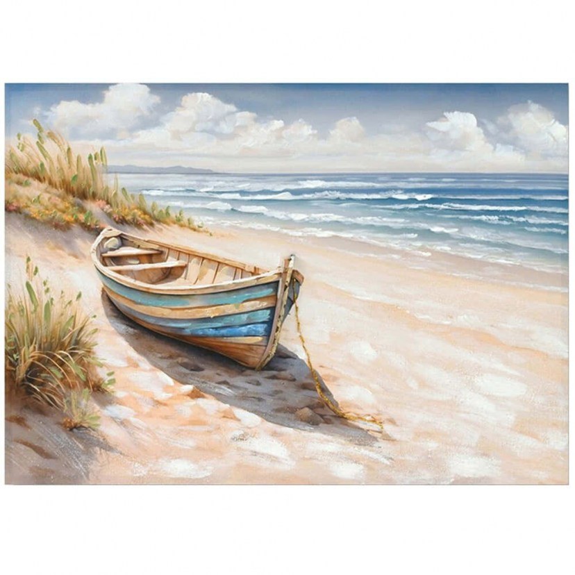 Ο Πίνακας Καμβάς Boato 296-000065 ξεχωρίζει με τα γήινα και θαλασσινά του χρώματα που δημιουργούν μια αίσθηση αρμονίας και σύνδεσης με τη φύση. Η απεικόνιση της θάλασσας, της άμμου και της βάρκας σχηματίζει ένα γαλήνιο και νοσταλγικό σύνολο, που ξυπνά αναμνήσεις από διακοπές, παιδικά χρόνια ή απλές βόλτες δίπλα στο κύμα. Κατασκευασμένος από καμβά και στιβαρό ξύλο fir, ο πίνακας αυτός προσφέρει αντοχή και διαχρονική αισθητική, ιδανικός για να φέρει μια φυσική και χαλαρωτική νότα σε κάθε χώρο.