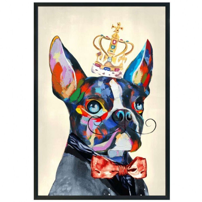 Κάντε πιο fancy και ξεχωριστή τη διακόσμηση του χώρου σας με τον Πίνακα Καμβά King Dog 022085. Εικονίζει έναν χαριτωμένο σκύλο με μουστάκι, στέμμα και κοστούμι, ενώ διαθέτει εντυπωσιακή χρωματική ποικιλία. Το σχέδιο είναι κατά 50% χειροποίητο και κατά 50% τυπωμένο.