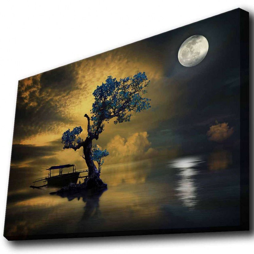 Ο Πίνακας Καμβάς Με Φως Led139LDG1134 απεικονίζει ένα υδάτινο φυσικό τοπίο με κεντρικό στοιχείο ένα μεγάλο δέντρο υπό το φως του φεγγαριού, δημιουργώντας μοναδική ατμόσφαιρα. Ο φωτισμός LED προσθέτει ένα εντυπωσιακό εφέ στον πίνακα, κάνοντάς τον να ξεχωρίζει και να δημιουργεί μια εντυπωσιακή εικόνα. Ο πίνακας καμβάς είναι κατασκευασμένος με προσοχή στη λεπτομέρεια, χρησιμοποιώντας πολυεστερικό καμβά και υψηλής ποιότητας ξύλινο πλαίσιο πάχους 3 cm. Η εύκολη χρήση του φωτισμού στον πίνακα, με το βολικό κουμπί ενεργοποίησης/απενεργοποίησης, τον καθιστούν ιδανική επιλογή για να φωτίσετε τον χώρο σας χωρίς τον φόβο αντιαισθητικών καλωδίων, καθώς το μόνο που απαιτεί είναι μία μπαταρία, η οποία δεν περιλαμβάνεται στη συσκευασία.
