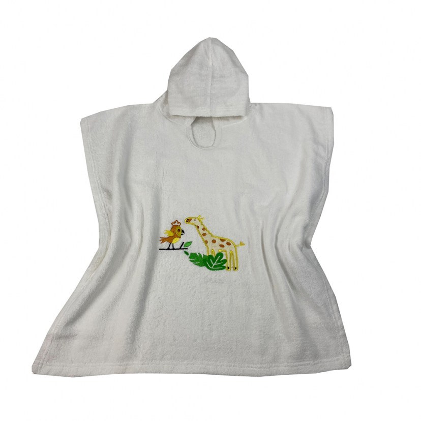 Το Παιδικό Πόντσο Zoo είναι ιδανικό για το παιδάκι σας που λατρεύει τα ζωάκια, καθώς φέρει παιχνιδιάρικο κέντημα, που αναπαριστά μία καμηλοπάρδαλη και ένα παπαγαλάκι.Πρόκειται για ένα πρακτικό πόντσο, το οποίο μπορεί να χρησιμοποιηθεί τόσο στο μπάνιο του σπιτιού σας όσο και στην παραλία. Είναι κατασκευασμένο από άριστης ποιότητας βαμβακερά νήματα, που το καθιστούν απαλό και απορροφητικό.