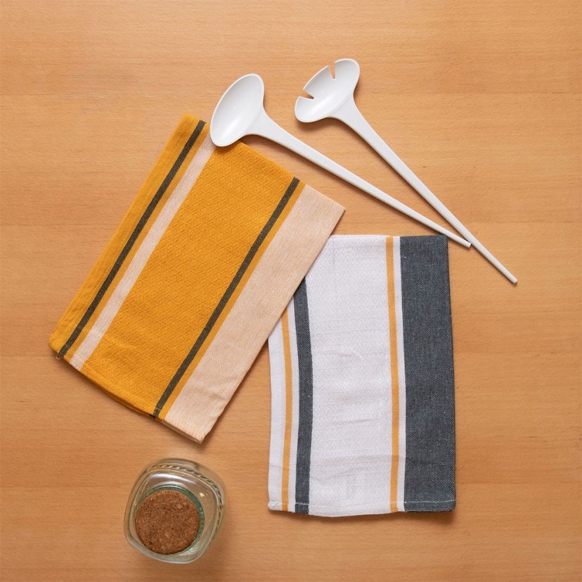 Το Σετ Ποτηρόπανα Σεφ περιλαμβάνει δύο ποτηρόπανα με μοντέρνο ριγέ σχέδιο σε υπέροχες αποχρώσεις. Είναι κατασκευασμένα από υψηλής ποιότητας βαμβακερό ζακάρ ύφασμα, προσφέροντας αντοχή και απορροφητικότητα. Είναι ιδανικά για χρήση ως πετσέτες για να σκουπίσετε τα χέρια ή τον πάγκο σας αλλά και ως ποτηρόπανα, ώστε να στεγνώσετε τα πιάτα και τα ποτήρια σας μετά το πλύσιμο.