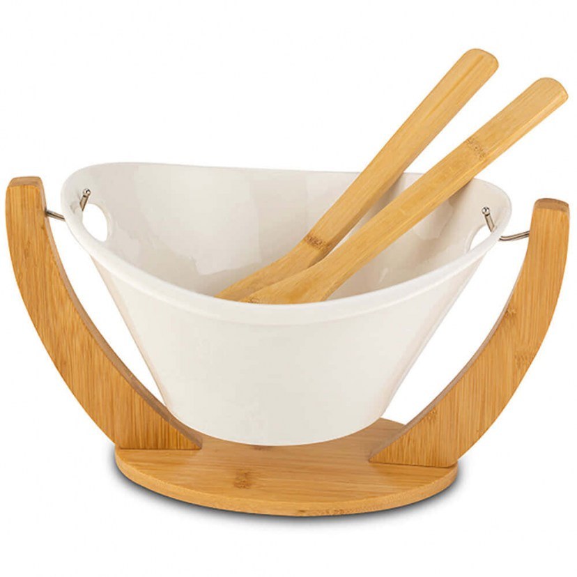 Το Σετ Σαλατιέρα Με Κουτάλες Σε Βάση Terrestrial (4Τμχ) 10-025-003 αποτελεί θαυμάσια επιλογή για εσάς που θέλετε να δώσετε ρουστίκ χαρακτήρα στην εικόνα του τραπεζιού σας. Αποτελείται από μία πορσελάνινη σαλατιέρα σε ξύλινη βάση και από δύο ξύλινες κουτάλες, που δημιουργούν ένα καλαίσθητο σύνολο. Ιδανική επιλογή για να σερβίρετε σαλάτες ή φρούτα για ένα καθημερινό οικογενειακό γεύμα ή για ιδιαίτερες περιστάσεις.