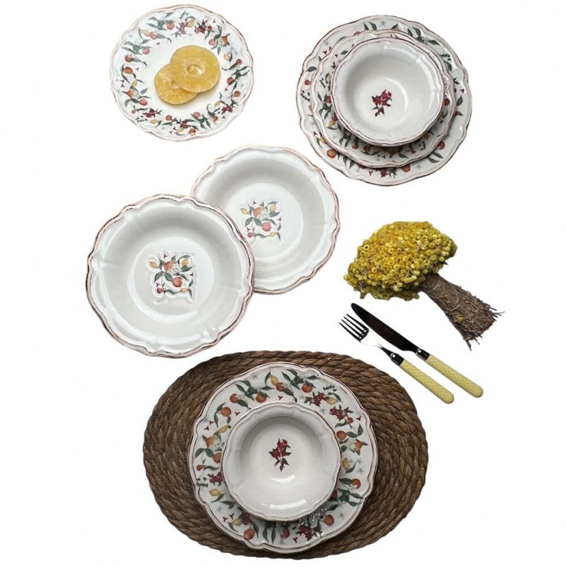 1 Σερβίτσιο Φαγητού: 6 Πιάτα Σερβιρίσματος: Διάμετρος: 25 cm, Ύψος: 2,5 cm & 6 Πιάτα Γλυκού: Διάμετρος: 22 cm, Ύψος: 2,5 cm & 6 Πιάτα: Διάμετρος: 21 cm, Ύψος: 3 cm & 6 Μπωλ: Διάμετρος: 15 cm, Ύψος: 4,5 cm