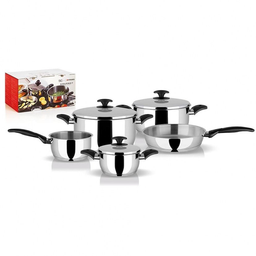 Το Σετ Μαγειρικών Σκευών Gourmet 015700901 περιλαμβάνει πέντε μαγειρικά σκεύη και τρία καπάκια. Πρόκειται για τρεις κατσαρόλες, ένα τηγάνι, μία γαλατιέρα και τρία καπάκια, από ανοξείδωτο υλικό 18/10, πάχους 0,7mm για το κυάθιο και 0,6mm για το καπάκι. Η τριπλή θερμοσυσσωρευτική βάση με φύλλο αλουμινίου πάχους 3,5-6mm και με μαγνητική κάψα 3mm από υλικό AISI 430, εγγυάται γρήγορο και οικονομικό μαγείρεμα, καθώς ο πάτος των σκευών ζεσταίνεται γρήγορα και διατηρεί τη θερμότητά του για μεγαλύτερο χρονικό διάστημα. Η κλίση του πάτου του σκεύους από το εξωτερικό προς το κέντρο, στο ιδανικό επίπεδο 10/1000, του εξασφαλίζει την τέλεια εφαρμογή του στις εστίες και μηδενικό σκέβρωμα. Φέρουν βακελιτικά χερούλια, θερμομονωτικά μέχρι και τους 220° C. Διαθέτουν ανοξείδωτα καπάκια με λειτουργικές καμπύλες, οι οποίες επιτρέπουν την καλύτερη κυκλοφορία των ατμών μέσα στα σκεύη. Είναι κατάλληλα για όλους τους τύπους εστιών: ηλεκτρικές, κεραμικές, γκαζιού και επαγωγικές.