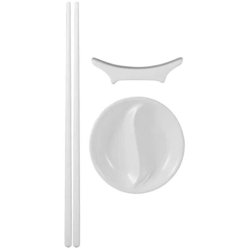 1 Σετ Σερβιρίσματος: 4 Ρηχά Στρογγυλά Μπολάκια Για Σως Με Χώρισμα: Διάμετρος: 10 cm & 4 Σετ Chopsticks: Μήκος: 24,5 cm & 4 Βάσεις Για Τα Ξυλάκια Chopsticks