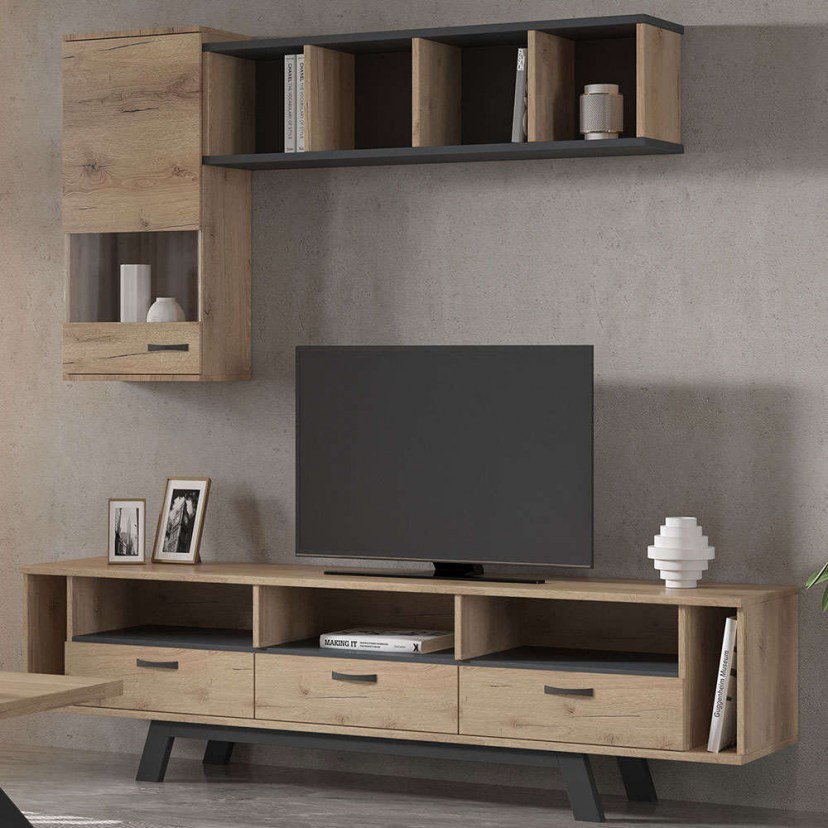 Η Σύνθεση Τηλεόρασης Νο56 αποτελεί εξαίσια επιλογή για το μοντέρνο σαλόνι της οικίας αλλά και για τον φιλόξενο χώρο υποδοχής της επιχείρησής σας, καθώς είναι μοντέρνο, όμορφο και ποιοτικό. Πρόκειται για μία υπέροχη σύνθεση, η οποία είναι κατασκευασμένη από MDF και μελαμίνη, δηλαδή από έναν συνδυασμό υλικών που την καθιστά ανθεκτική στο χρόνο και στη χρήση. Το κεντρικό έπιπλο της σύνθεσης περιλαμβάνει κλειστούς αποθηκευτικούς χώρους για να φυλάξετε διάφορα αντικείμενα και φέρει ράφια που είναι η ιδανική θέση για την τοποθέτηση των ηλεκτρικών συσκευών σας. Ωστόσο, η εντυπωσιακή ομορφιά της σύνθεσης έρχεται από τη μία επιτοίχια ραφιέρα και η επιτοίχια βιτρίνα, που δημιουργούν μία εντυπωσιακή διάταξη στον τοίχο, επιτρέποντάς σας να εκθέσετε τα αγαπημένα σας διακοσμητικά, να αποθηκεύσετε αντικείμενα, ή ακόμα και να οργανώσετε τη συλλογή σας με τρόπο που σας αντιπροσωπεύει πλήρως. Το προϊόν παραδίδεται αμοντάριστο.