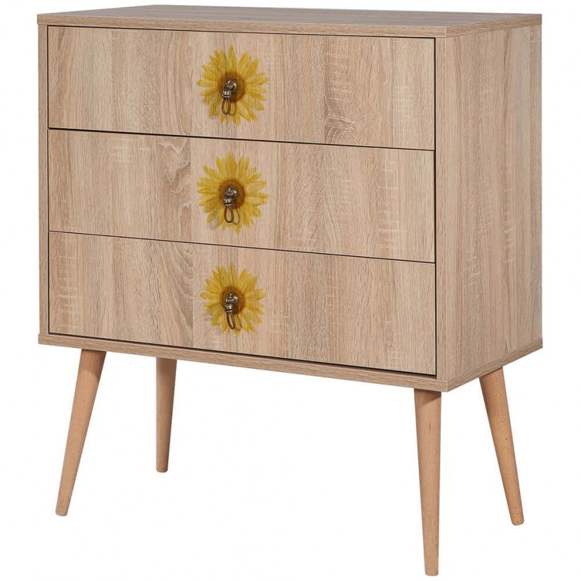 Η Συρταριέρα City Trio Seed διαθέτει εντυπωσιακό σχέδιο με χρωματιστούς ηλίανθους, το οποίο είναι σχεδιασμένο με ψηφιακή εκτύπωση UV που δημιουργεί μια μαγευτική απεικόνιση χρωμάτων και μοτίβων. Διαθέτει τρία ευρύχωρα συρτάρια, ιδανικά για την αποθήκευση προσωπικών αντικειμένων με άνεση και τάξη. Κατασκευασμένη από μοριοσανίδα με επικάλυψη μελαμίνης, η συρταριέρα είναι εξαιρετικά ανθεκτική και φτιαγμένη για να διαρκέσει. Τα στιβαρά ξύλινα πόδια προσφέρουν εξαιρετική σταθερότητα, διασφαλίζοντας ότι η συρταριέρα σας θα παραμείνει σε άψογη κατάσταση για πολλά χρόνια. Μια ιδανική επιλογή για να αναδείξετε το στυλ του χώρου σας με μια σύγχρονη και κομψή πινελιά.